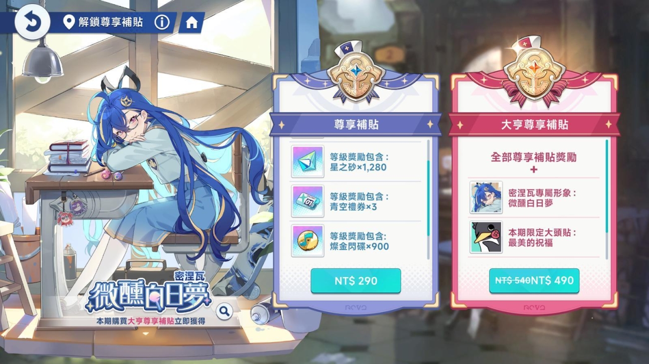 尊享補貼提供多種資源、抽卡券與星之砂。30級獎勵為祕紋自選包,內含目前卡池中抽不到的限定祕紋。