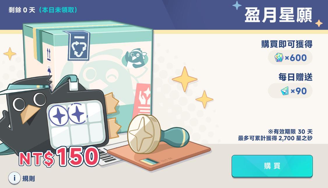 每月 150T,可立即獲得 600 星之彩,之後每日領取 90 星之砂。